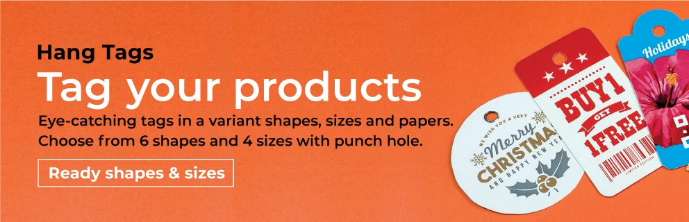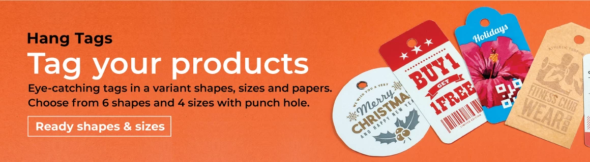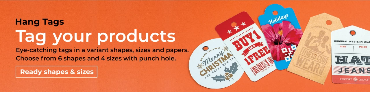 Eye-catching tags in a variant shapes, sizes and papers. Choose from 6 shapes and 4 sizes with punch hole.
